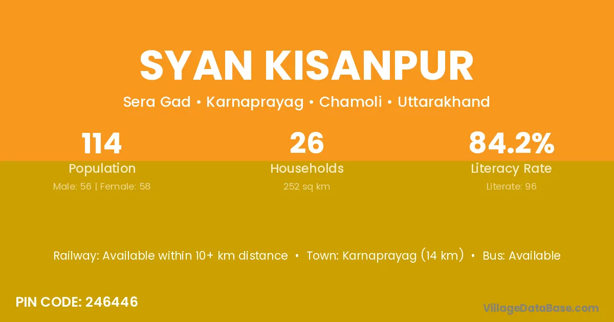 Karnaprayag (14 km) is the nearest town to Syan Kisanpur village for major economic activities and is located approximately 14 km away.
