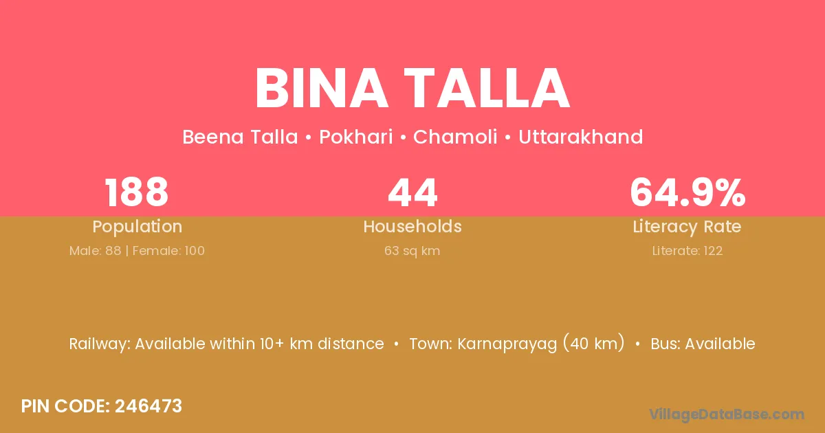 Karnaprayag (40 km) is the nearest town to Bina Talla village for major economic activities and is located approximately 40 km away.