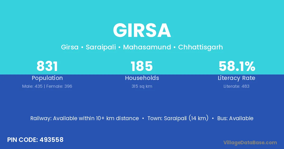The literacy rate of Girsa village is 77.72%. Male literacy stands at 86.67% and female literacy at 68.86%.