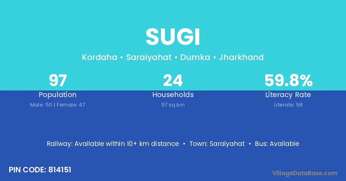 The literacy rate of Sugi village is 76.63%. Male literacy stands at 88.24% and female literacy at 64.00%.
