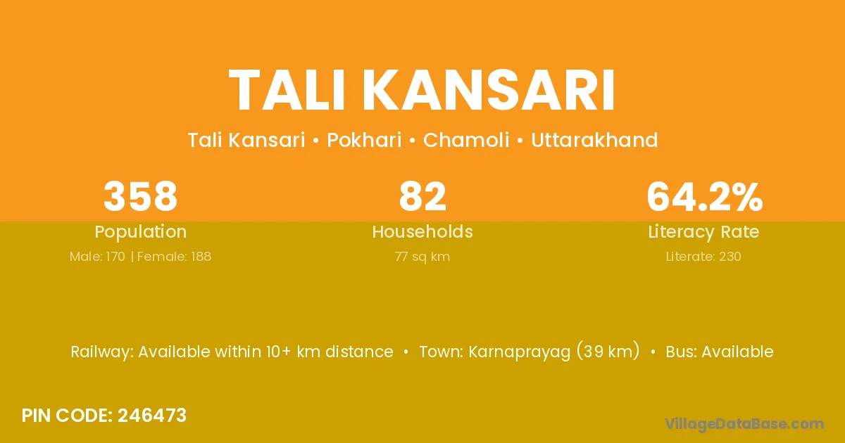 Karnaprayag (39 km) is the nearest town to Tali Kansari village for major economic activities and is located approximately 39 km away.