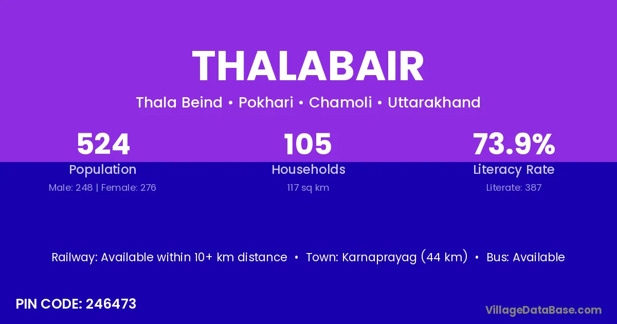 Karnaprayag (44 km) is the nearest town to Thalabair village for major economic activities and is located approximately 44 km away.