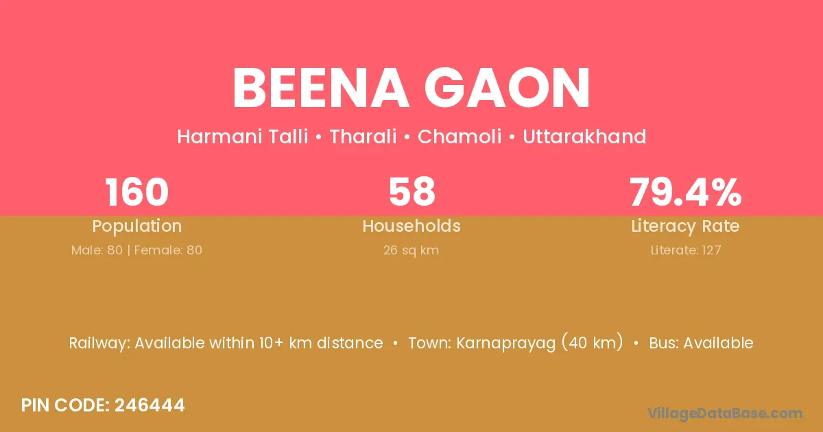 Karnaprayag (40 km) is the nearest town to Beena Gaon village for major economic activities and is located approximately 40 km away.