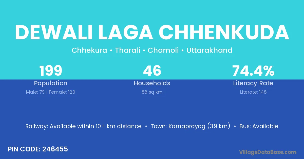 Karnaprayag (39 km) is the nearest town to Dewali Laga Chhenkuda village for major economic activities and is located approximately 39 km away.