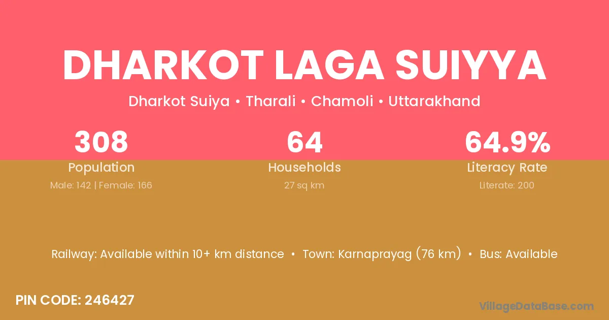 Karnaprayag (76 km) is the nearest town to Dharkot Laga Suiyya village for major economic activities and is located approximately 76 km away.