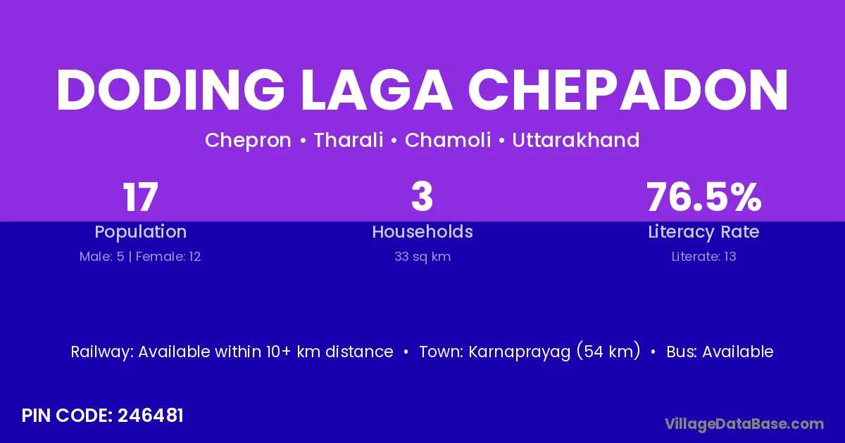 Karnaprayag (54 km) is the nearest town to Doding Laga Chepadon village for major economic activities and is located approximately 54 km away.