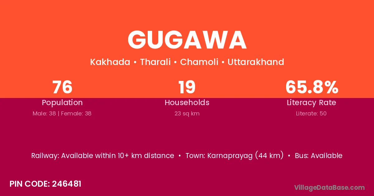 Karnaprayag (44 km) is the nearest town to Gugawa village for major economic activities and is located approximately 44 km away.