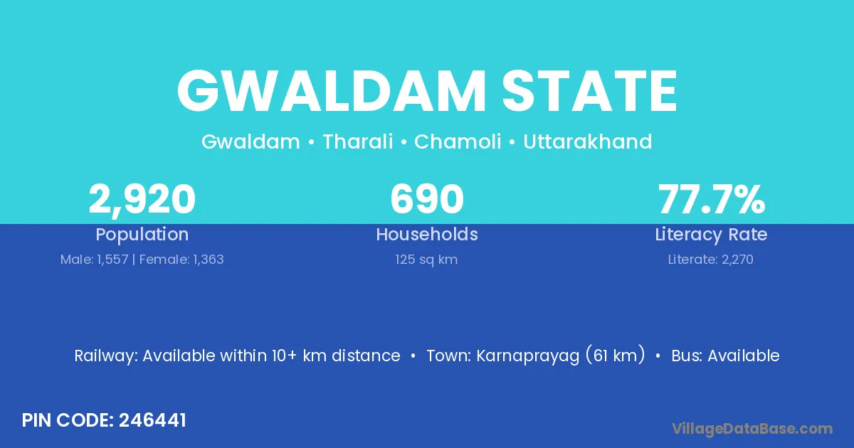 Karnaprayag (61 km) is the nearest town to Gwaldam State village for major economic activities and is located approximately 61 km away.