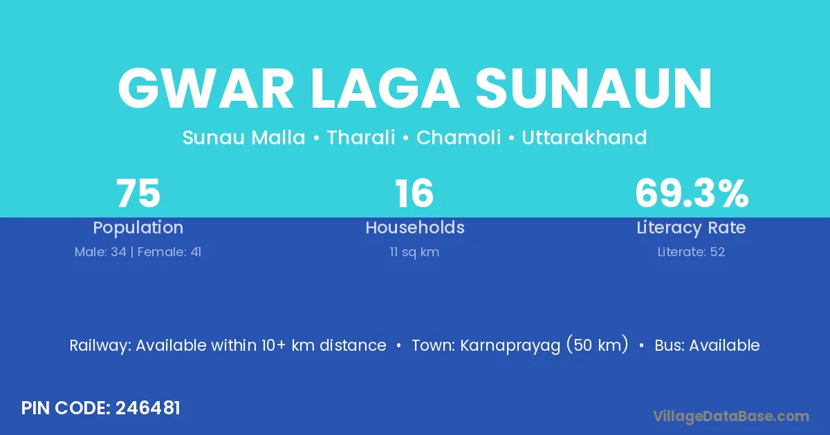Karnaprayag (50 km) is the nearest town to Gwar Laga Sunaun village for major economic activities and is located approximately 50 km away.