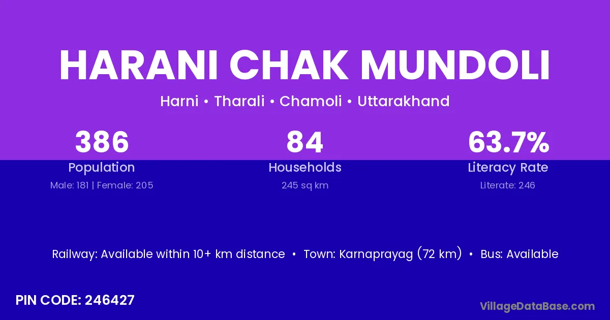 Karnaprayag (72 km) is the nearest town to Harani Chak Mundoli village for major economic activities and is located approximately 72 km away.