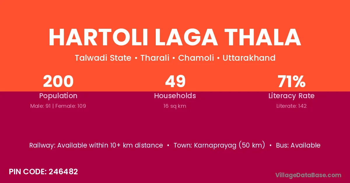 Karnaprayag (50 km) is the nearest town to Hartoli Laga Thala village for major economic activities and is located approximately 50 km away.