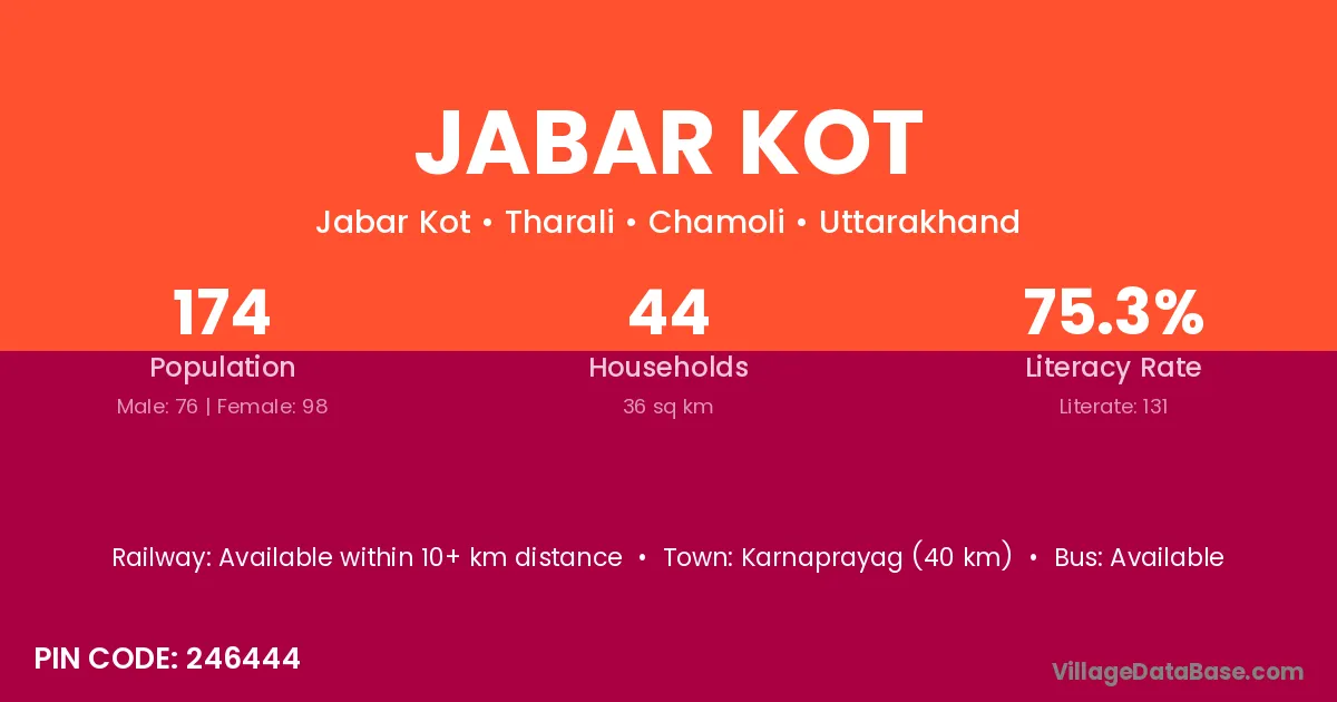 Karnaprayag (40 km) is the nearest town to Jabar Kot village for major economic activities and is located approximately 40 km away.