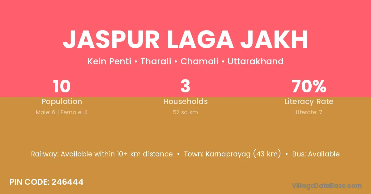 Karnaprayag (43 km) is the nearest town to Jaspur Laga Jakh village for major economic activities and is located approximately 43 km away.