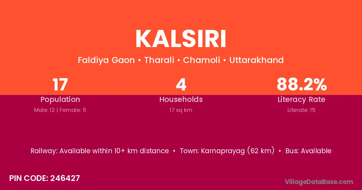 Karnaprayag (62 km) is the nearest town to Kalsiri village for major economic activities and is located approximately 62 km away.