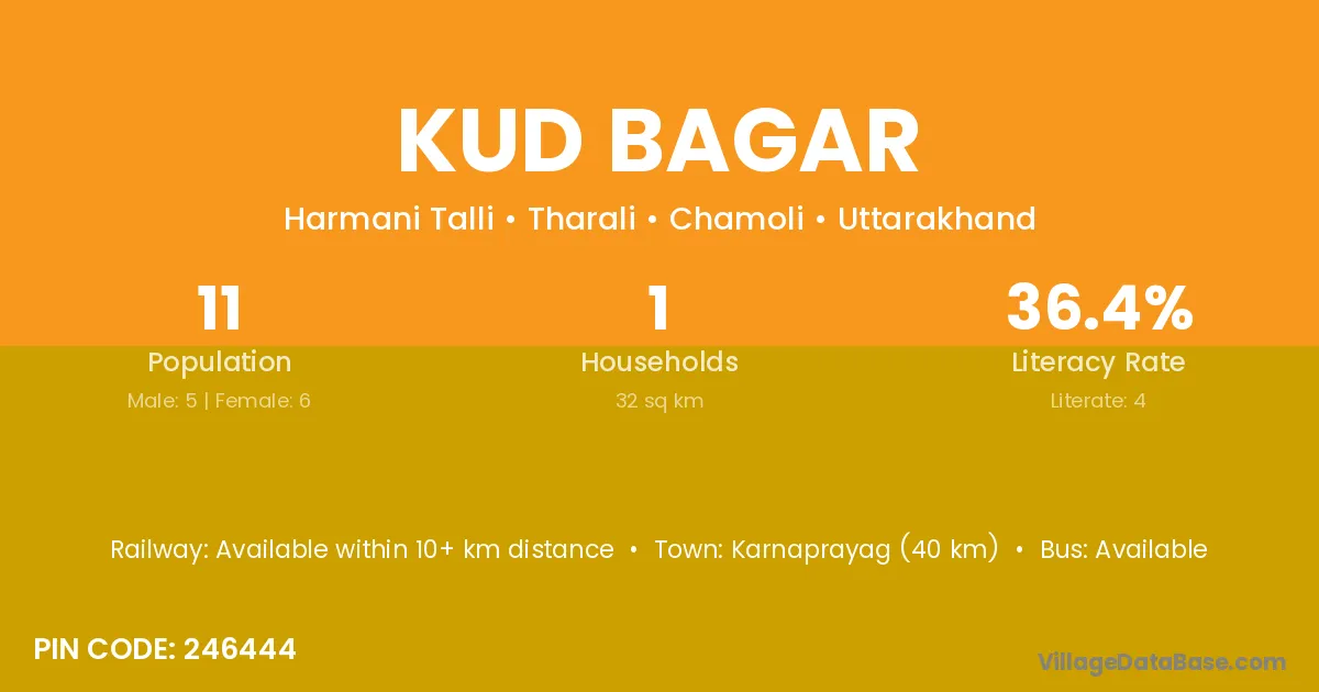 Karnaprayag (40 km) is the nearest town to Kud Bagar village for major economic activities and is located approximately 40 km away.