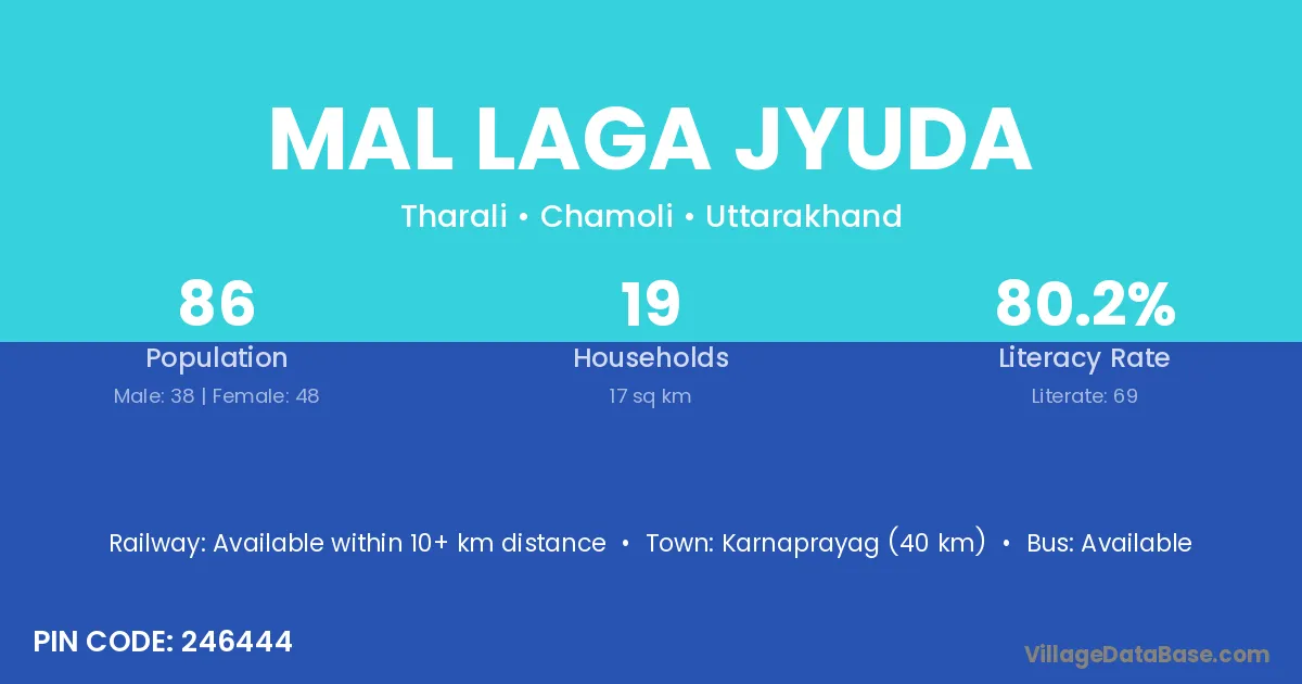 Karnaprayag (40 km) is the nearest town to Mal Laga Jyuda village for major economic activities and is located approximately 40 km away.