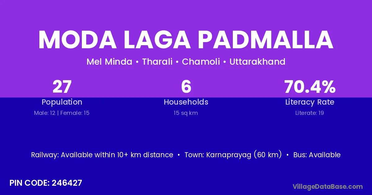 Karnaprayag (60 km) is the nearest town to Moda Laga Padmalla village for major economic activities and is located approximately 60 km away.