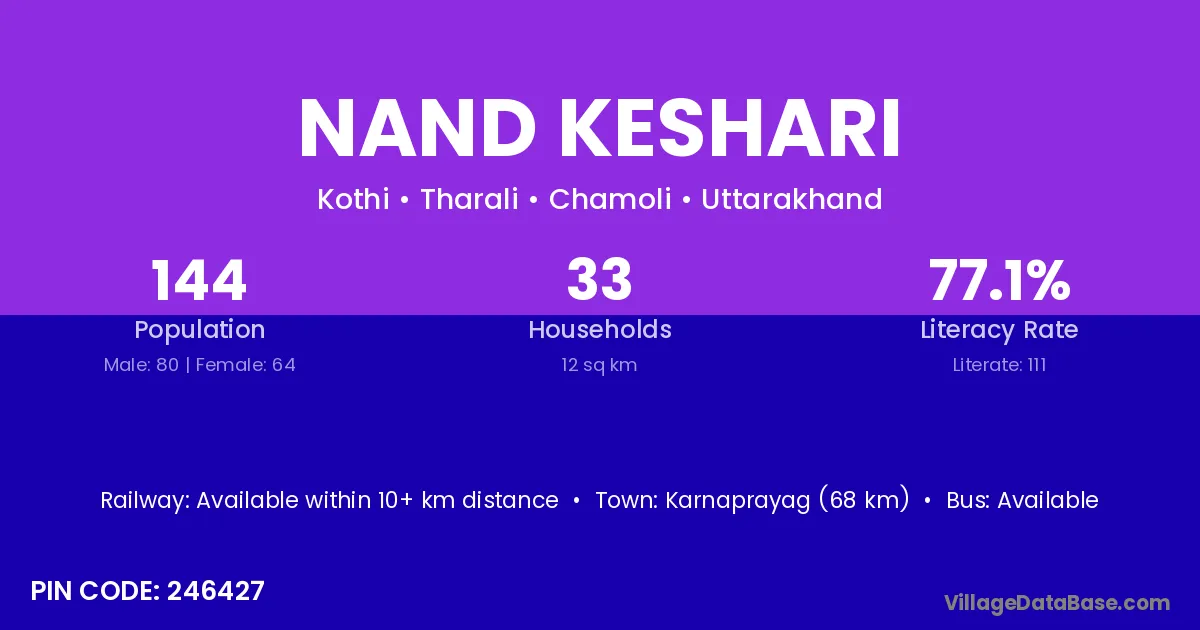 Karnaprayag (68 km) is the nearest town to Nand Keshari village for major economic activities and is located approximately 68 km away.
