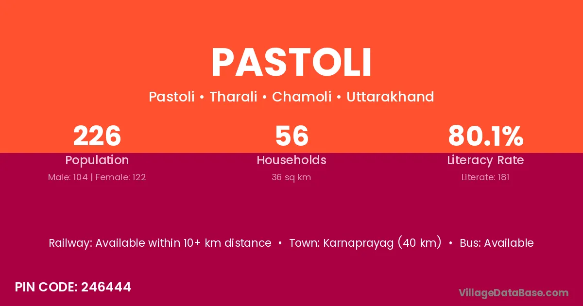 Karnaprayag (40 km) is the nearest town to Pastoli village for major economic activities and is located approximately 40 km away.