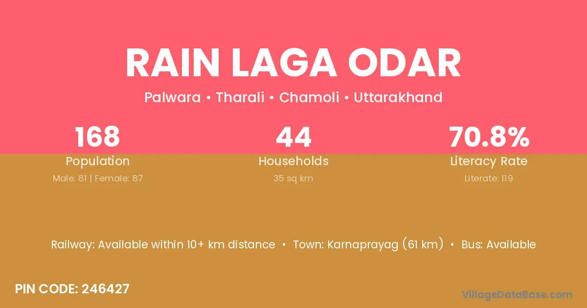 Karnaprayag (61 km) is the nearest town to Rain Laga Odar village for major economic activities and is located approximately 61 km away.