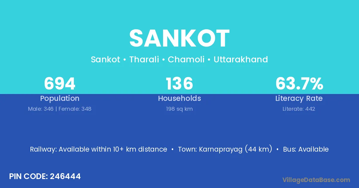 Karnaprayag (44 km) is the nearest town to Sankot village for major economic activities and is located approximately 44 km away.