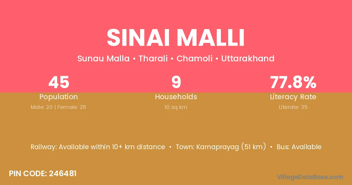 Karnaprayag (51 km) is the nearest town to Sinai Malli village for major economic activities and is located approximately 51 km away.