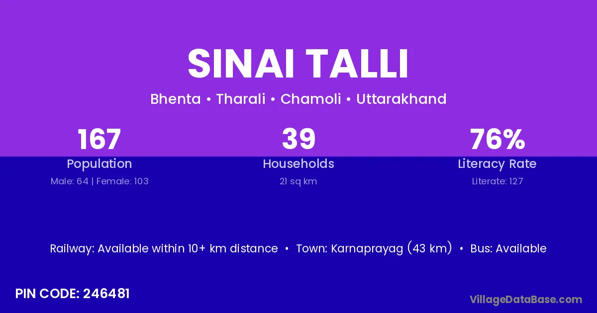 Karnaprayag (43 km) is the nearest town to Sinai Talli village for major economic activities and is located approximately 43 km away.