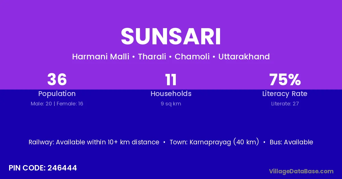 Karnaprayag (40 km) is the nearest town to Sunsari village for major economic activities and is located approximately 40 km away.