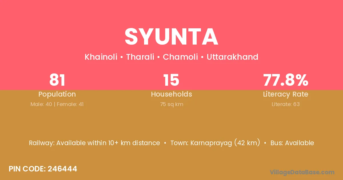 Karnaprayag (42 km) is the nearest town to Syunta village for major economic activities and is located approximately 42 km away.