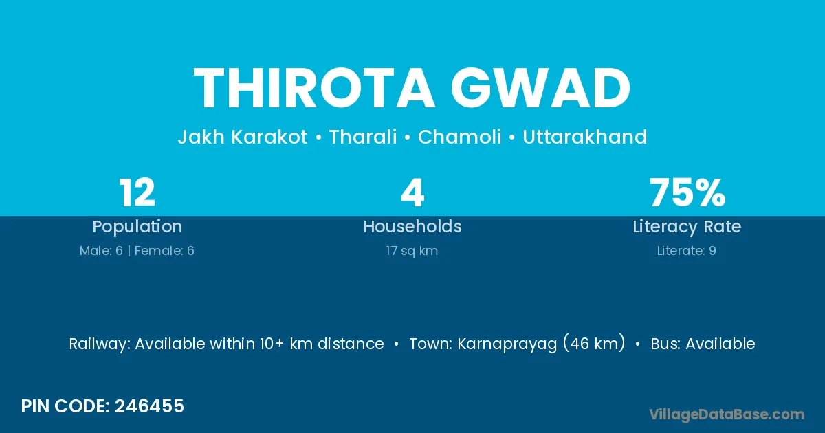 Karnaprayag (46 km) is the nearest town to Thirota Gwad village for major economic activities and is located approximately 46 km away.