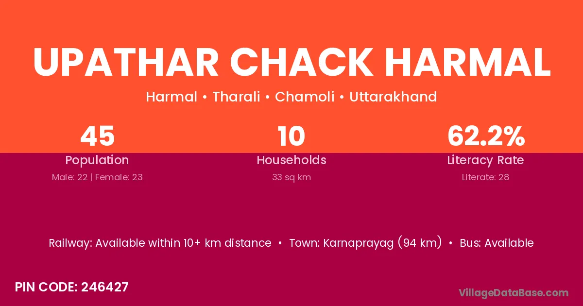 Karnaprayag (94 km) is the nearest town to Upathar Chack Harmal village for major economic activities and is located approximately 94 km away.