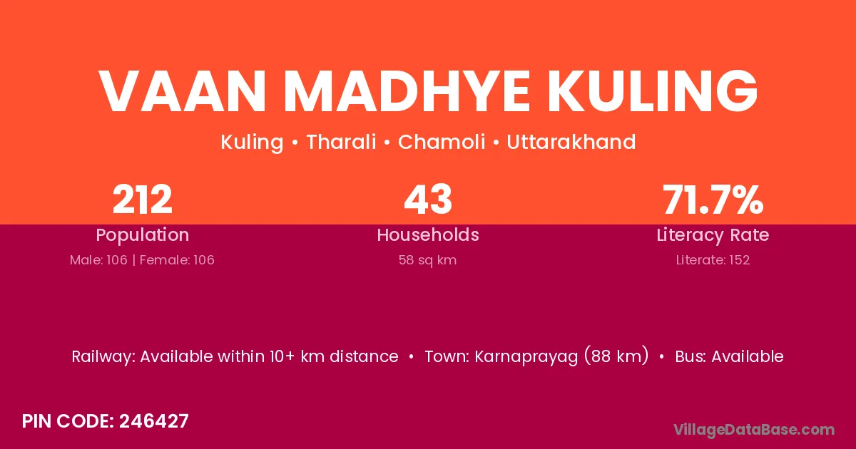 Karnaprayag (88 km) is the nearest town to Vaan Madhye Kuling village for major economic activities and is located approximately 88 km away.