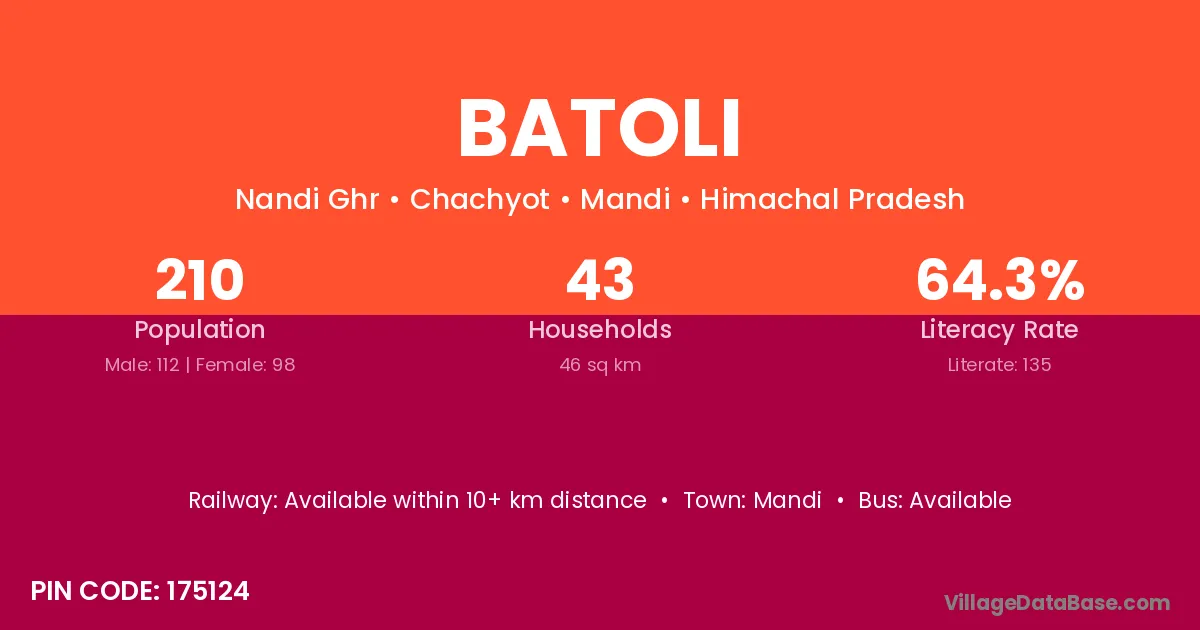 Batoli village has a total population of 73 people, of which 36 are males and 37 are females.