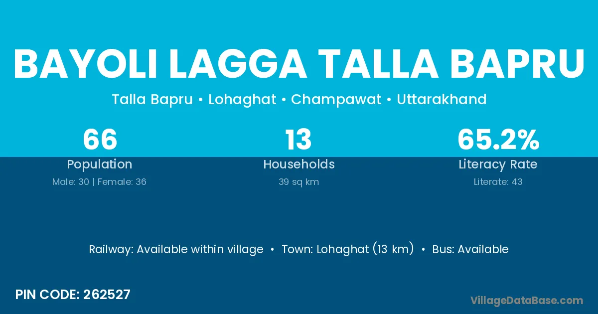 Lohaghat (13 km) is the nearest town to Bayoli Lagga Talla Bapru village for major economic activities and is located approximately 13 km away.