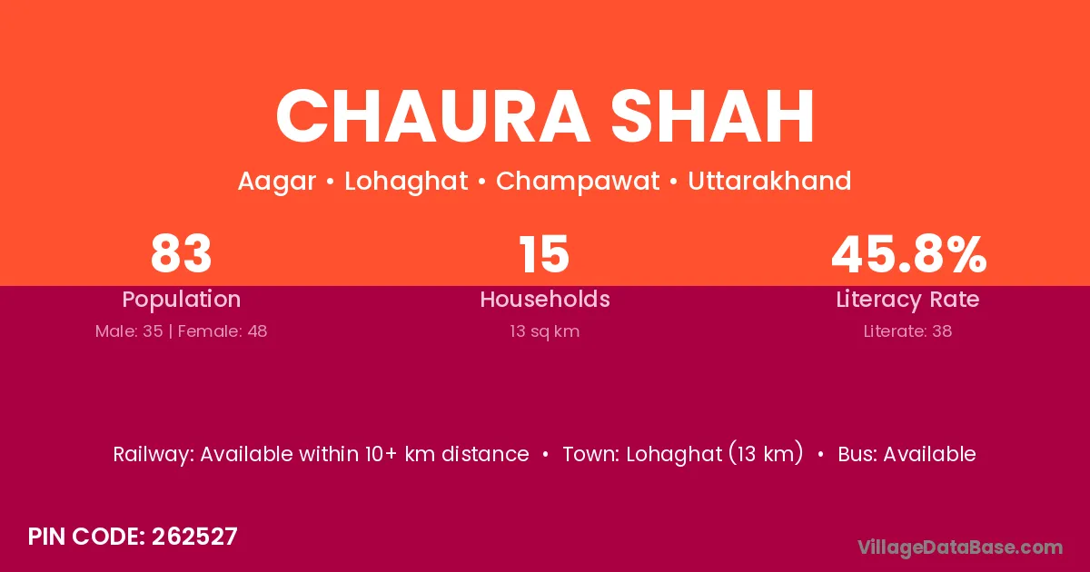 Lohaghat (13 km) is the nearest town to Chaura Shah village for major economic activities and is located approximately 13 km away.