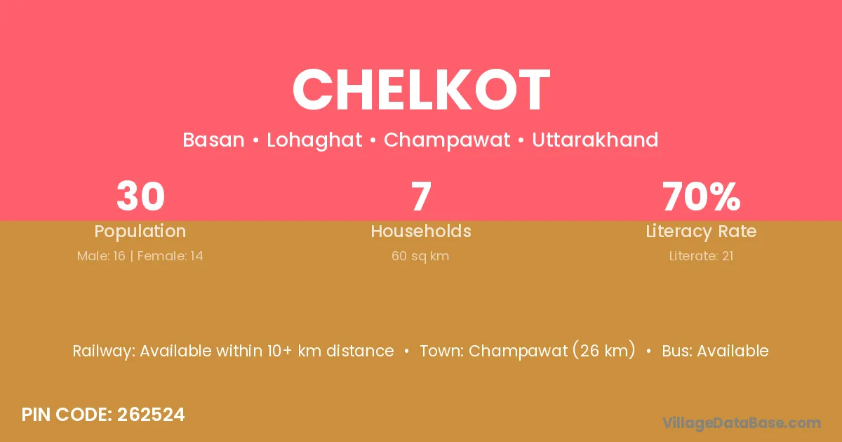 Champawat (26 km) is the nearest town to Chelkot village for major economic activities and is located approximately 26 km away.
