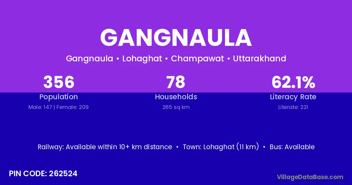 Lohaghat (11 km) is the nearest town to Gangnaula village for major economic activities and is located approximately 11 km away.