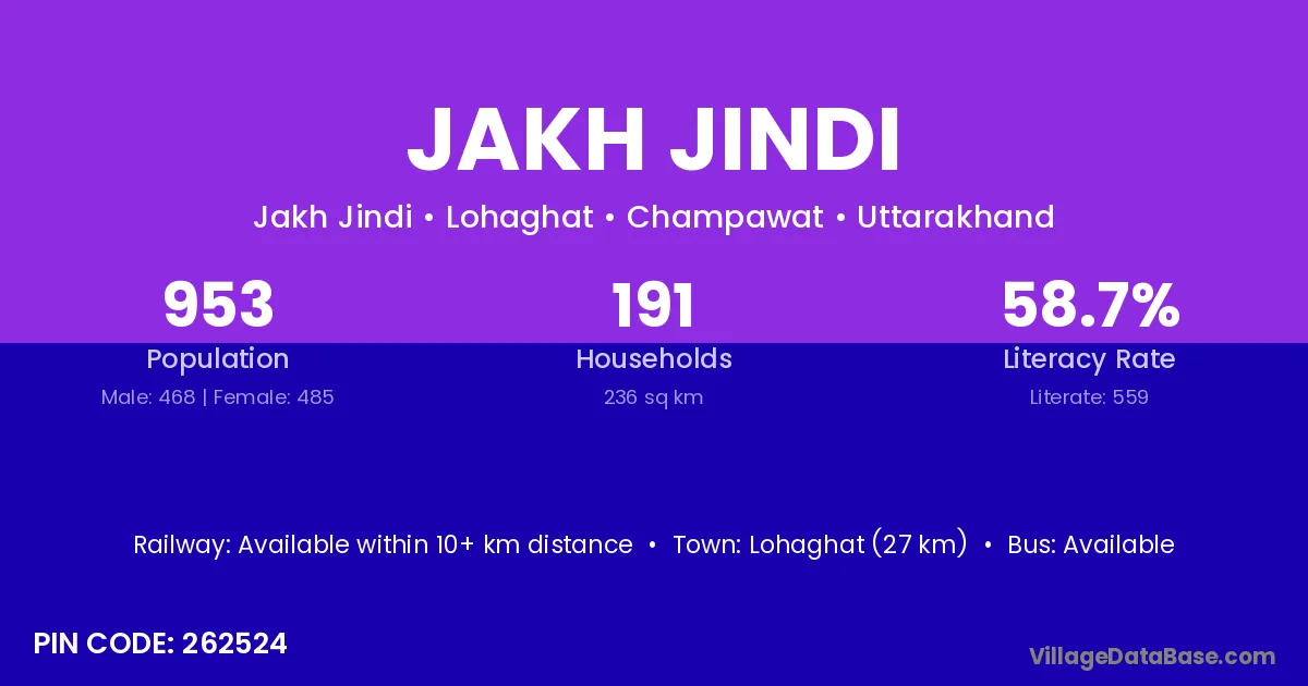 Lohaghat (27 km) is the nearest town to Jakh Jindi village for major economic activities and is located approximately 27 km away.