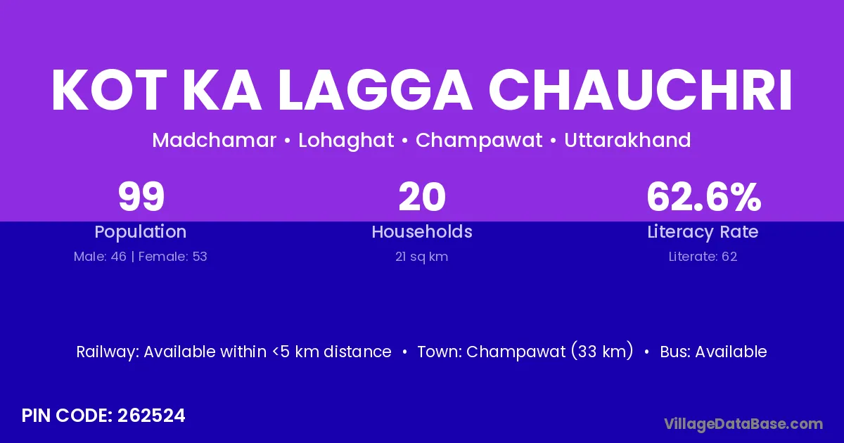 Champawat (33 km) is the nearest town to Kot Ka Lagga Chauchri village for major economic activities and is located approximately 33 km away.
