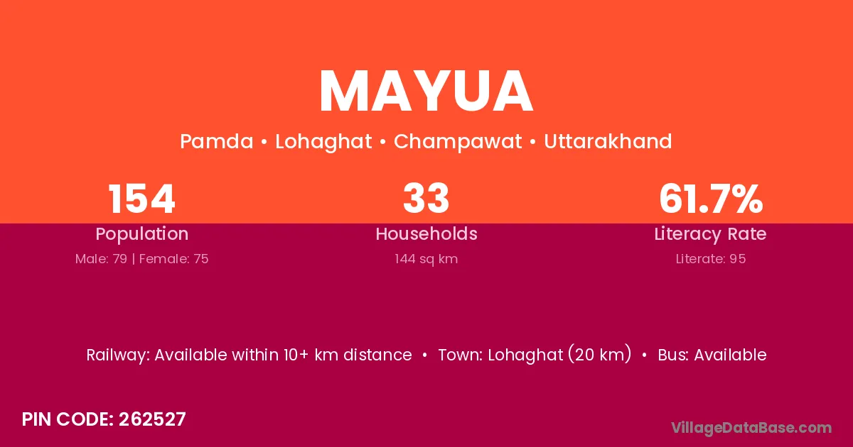 Lohaghat (20 km) is the nearest town to Mayua village for major economic activities and is located approximately 20 km away.