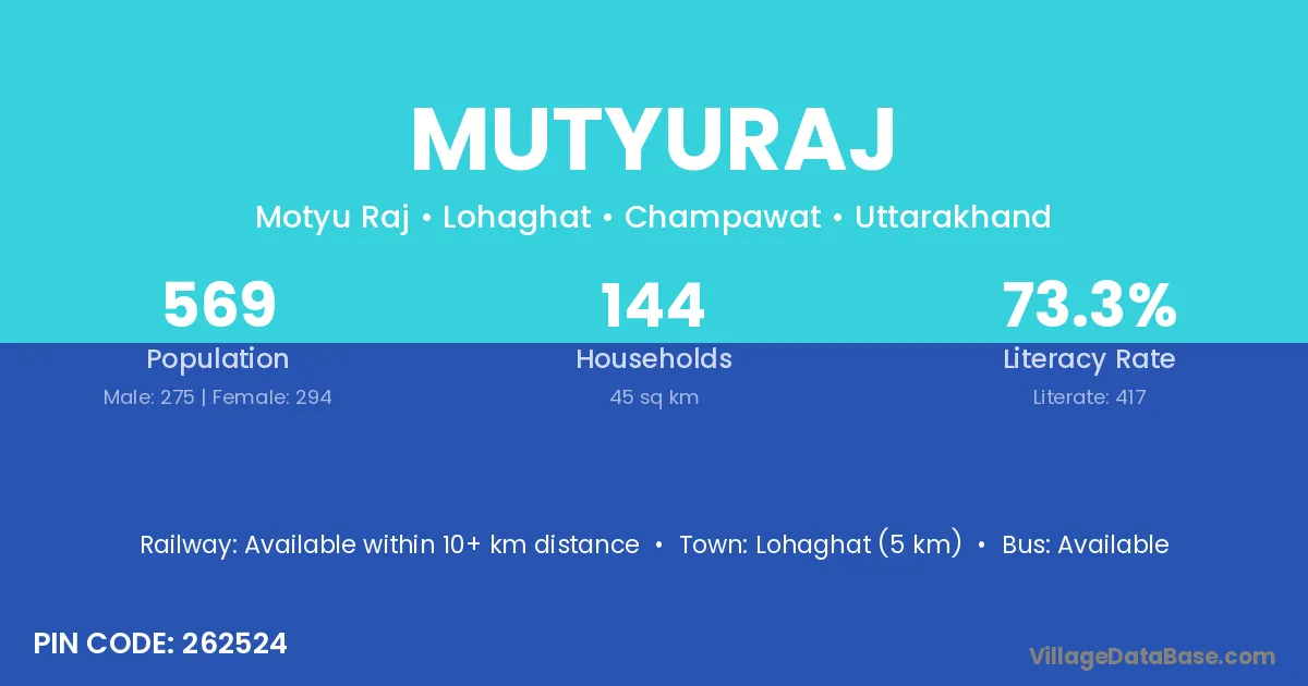 Lohaghat (5 km) is the nearest town to Mutyuraj village for major economic activities and is located approximately 5 km away.