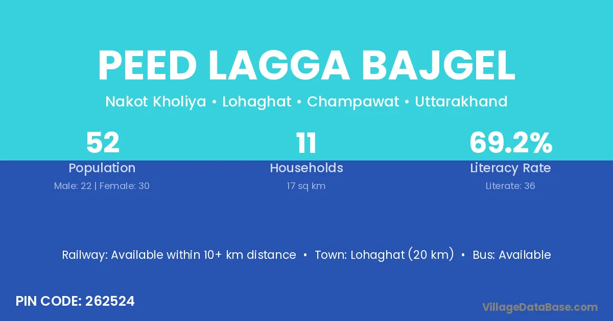 Lohaghat (20 km) is the nearest town to Peed Lagga Bajgel village for major economic activities and is located approximately 20 km away.