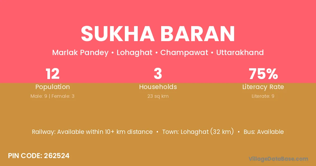 Lohaghat (32 km) is the nearest town to Sukha Baran village for major economic activities and is located approximately 32 km away.