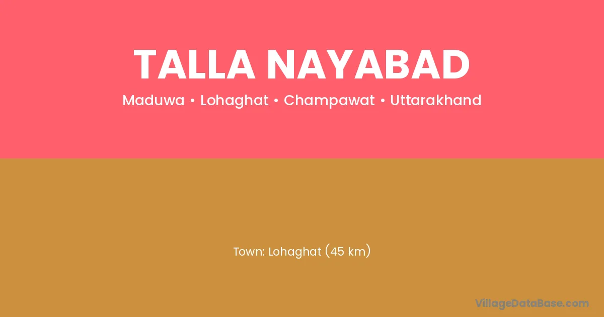 Lohaghat (45 km) is the nearest town to Talla Nayabad village for major economic activities and is located approximately 45 km away.