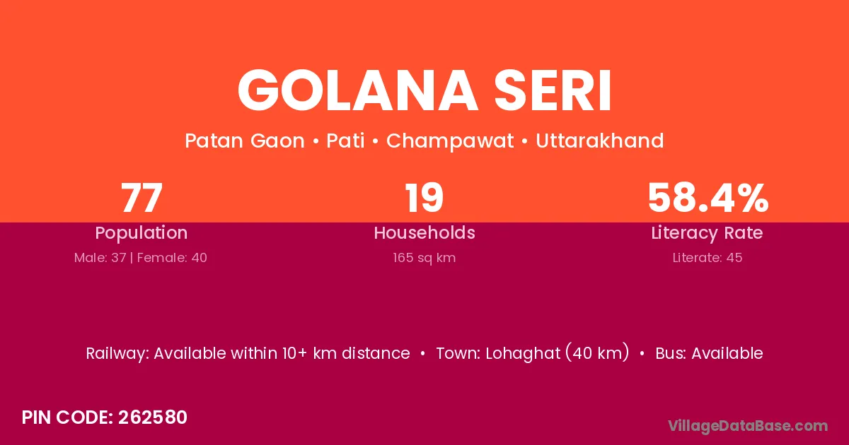 Lohaghat (40 km) is the nearest town to Golana Seri village for major economic activities and is located approximately 40 km away.
