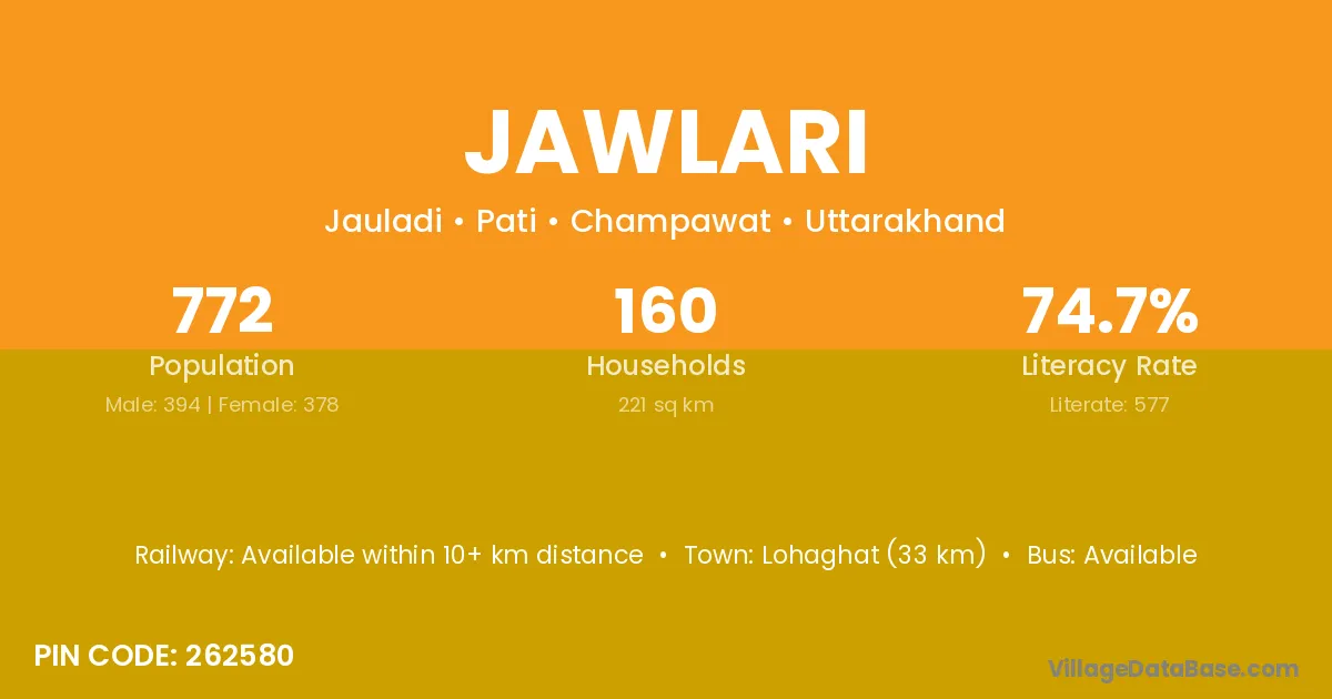 Lohaghat (33 km) is the nearest town to Jawlari village for major economic activities and is located approximately 33 km away.