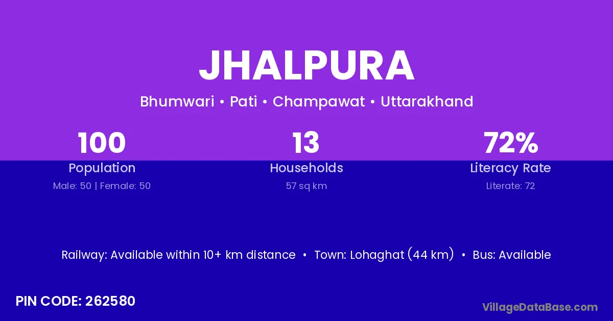 Lohaghat (44 km) is the nearest town to Jhalpura village for major economic activities and is located approximately 44 km away.