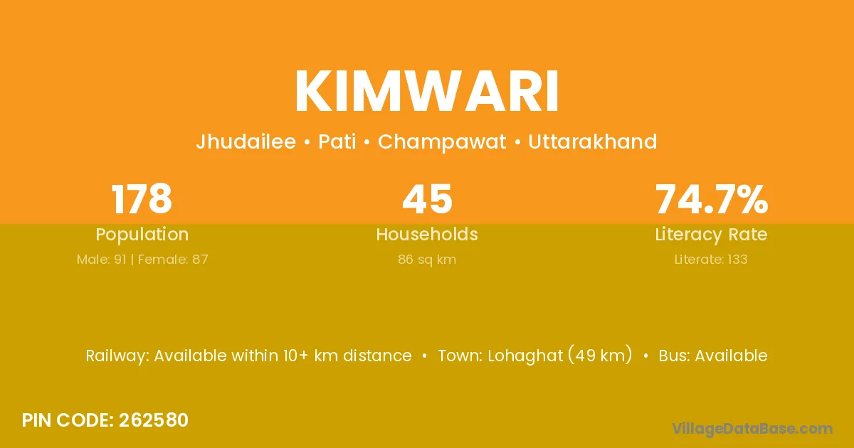 Lohaghat (49 km) is the nearest town to Kimwari village for major economic activities and is located approximately 49 km away.