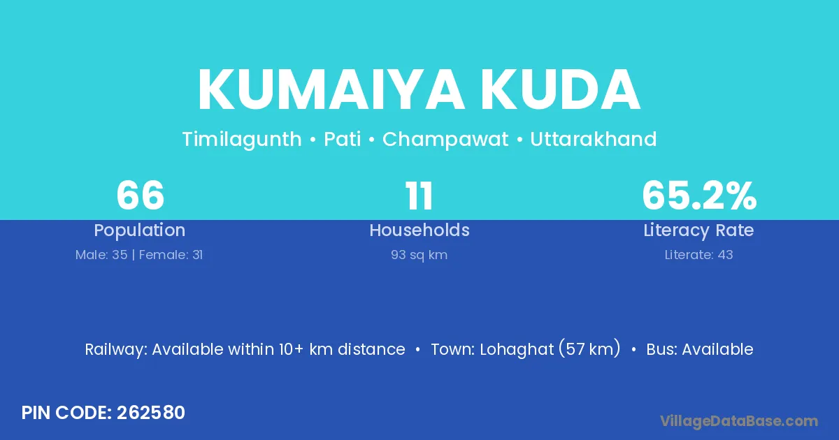 Lohaghat (57 km) is the nearest town to Kumaiya Kuda village for major economic activities and is located approximately 57 km away.