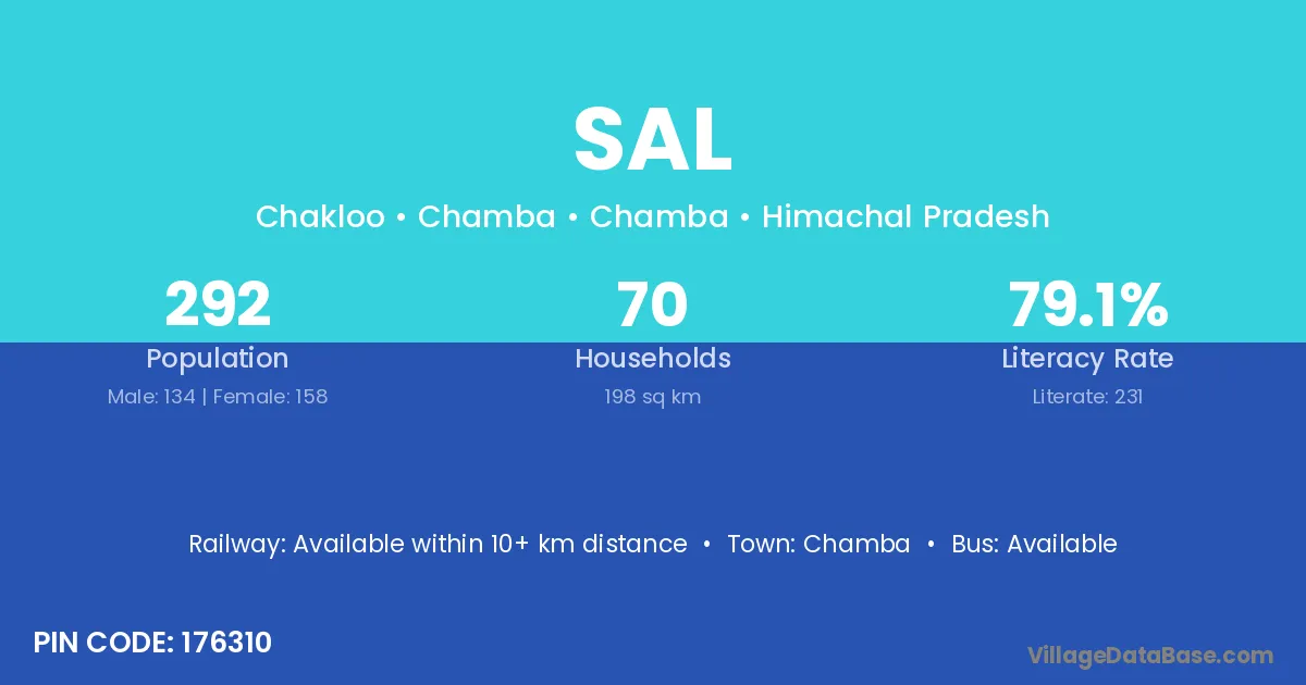 The literacy rate of Sal village is 63.87%. Male literacy stands at 77.22% and female literacy at 51.90%.